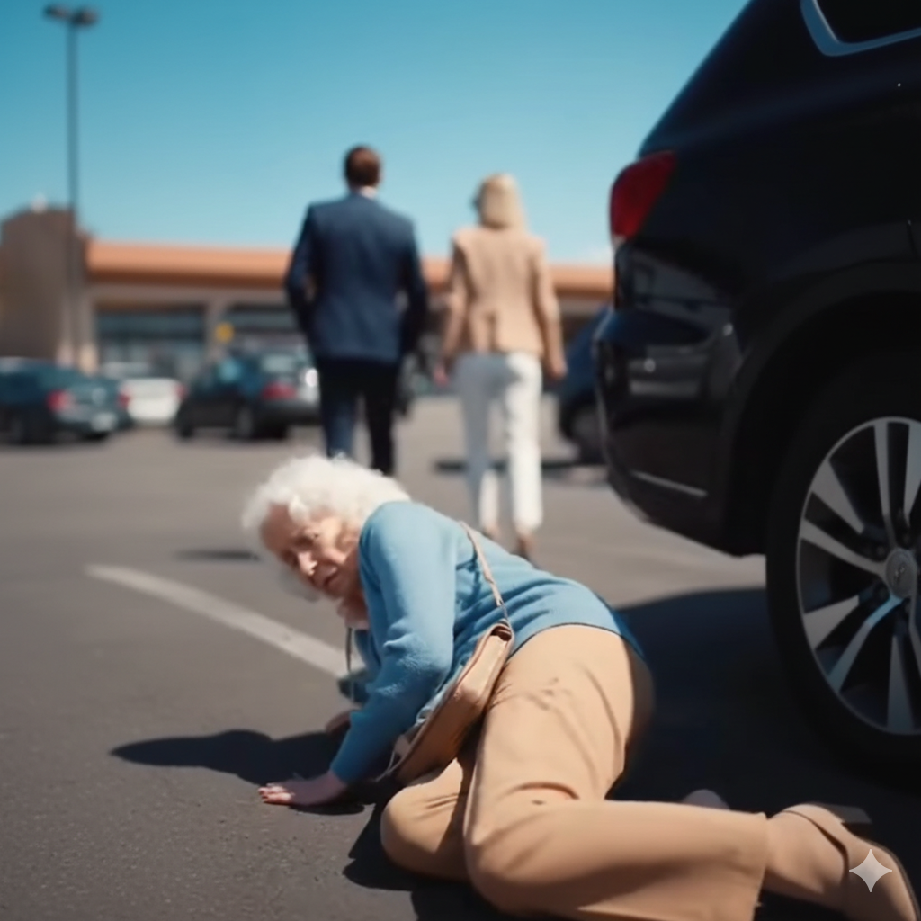 The elderly woman stumbled backward, her hip slamming the car before she collapsed onto the asphalt. Pain exploded up her arm.